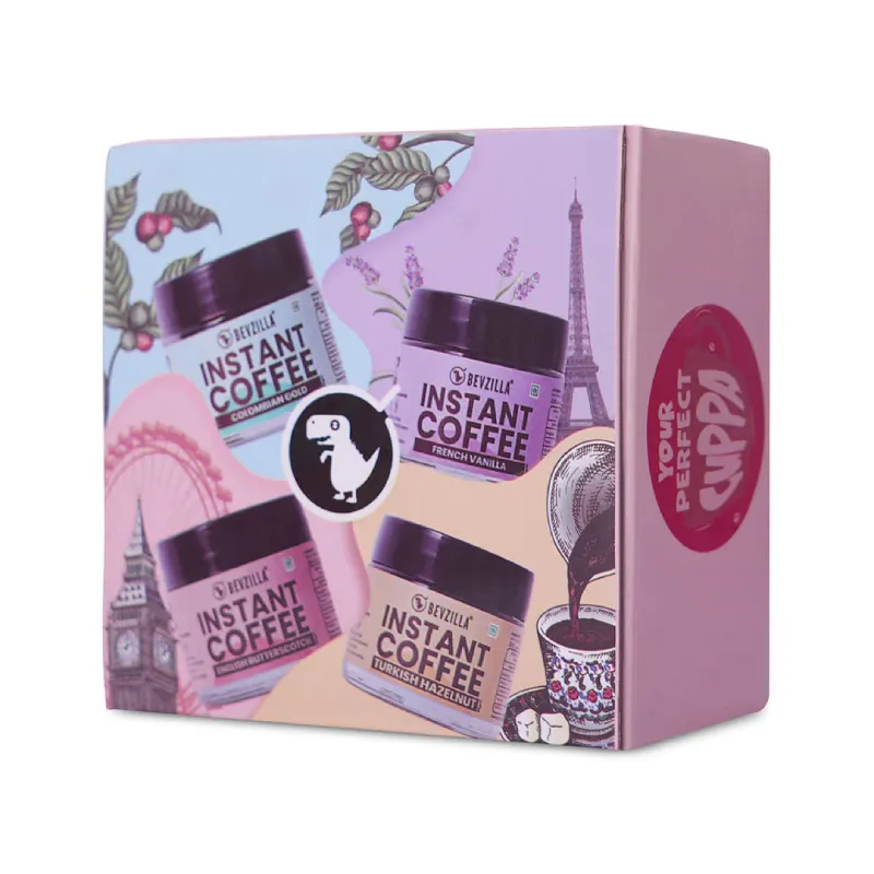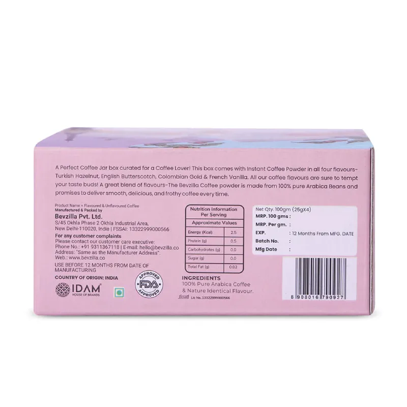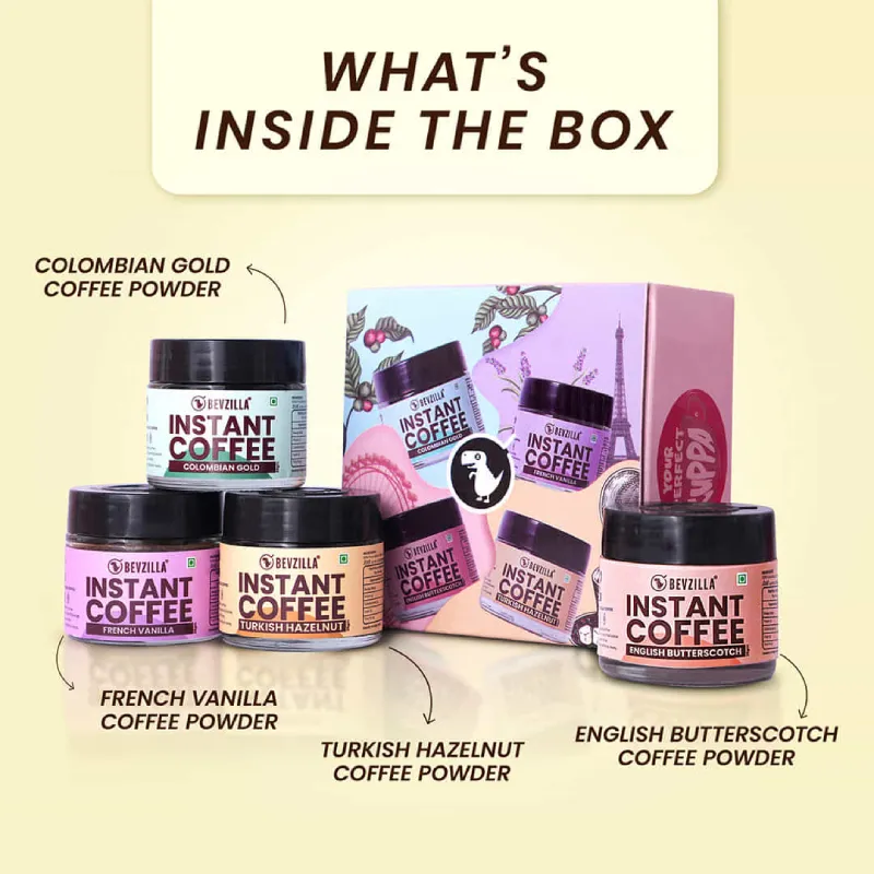 • Indulge in Bevzilla’s Coffee Jars Combo, featuring four tantalizing flavors: Turkish Hazelnut, English Butterscotch, Colombian Gold, and French Vanilla.