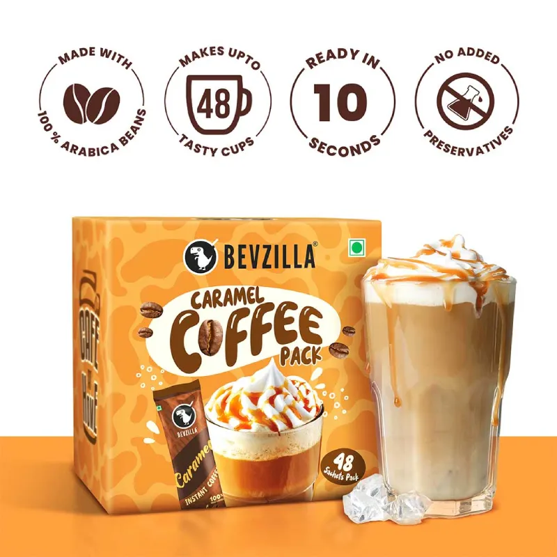 Experience the fusion of convenience and indulgence with Bevzilla’s Caramel Instant Coffee Powder. Crafted meticulously from 100% Pure Arabica Beans, each sachet encapsulates the essence of a premium cafe-like experience, now in the comfort of your own home. Delight your senses with the smooth, frothy texture and the tantalizing aroma of caramel that will leave you craving for more.