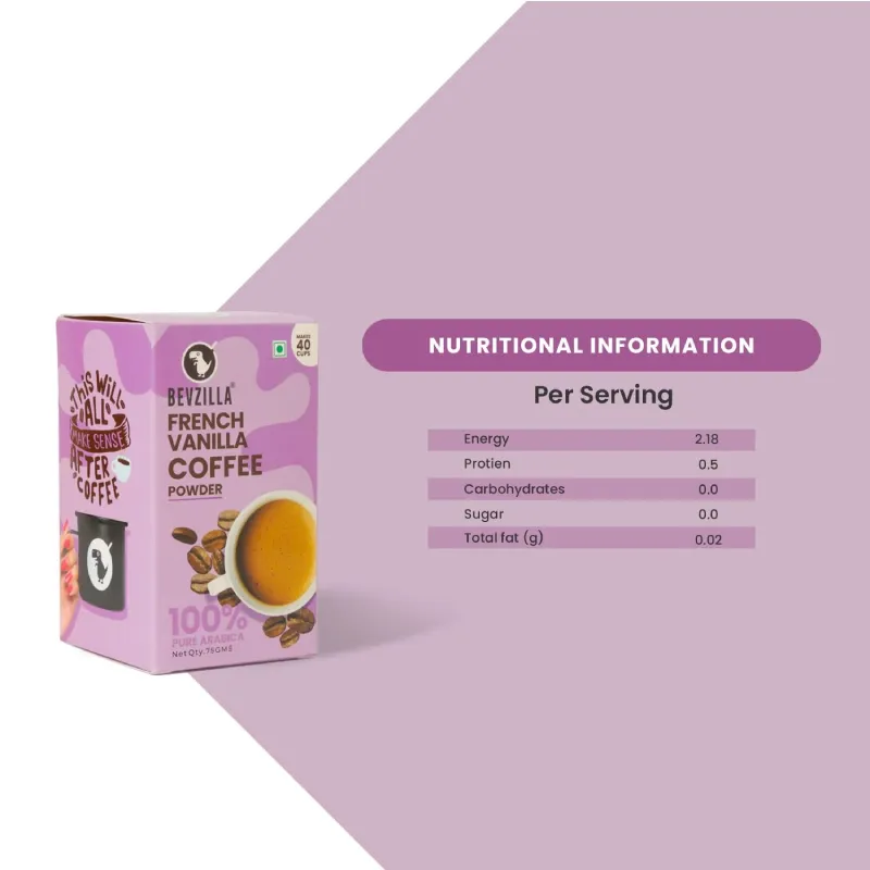 - Premium Quality Coffee: Bevzilla’s French Vanilla Instant Coffee Powder is derived from 100% Pure Arabica Beans, ensuring a rich and authentic coffee experience with every cup.