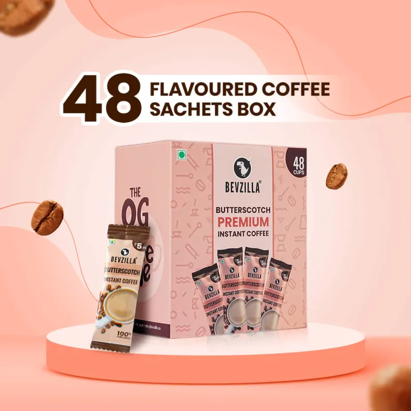 Indulge in the real goodness of 100% Pure Arabica Beans with Bevzilla’s Butterscotch Coffee Powder Sachets. Our blend promises a smooth, delicious, and frothy coffee experience every time, making it a healthier alternative to your regular coffee. With 48 convenient sachets per box, enjoy the premium taste of freshly brewed cafe-like coffee at home, anytime, anywhere.