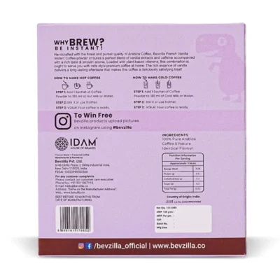 Indulge in the real goodness of 100% Pure Arabica Beans with Bevzilla’s French Vanilla Coffee Powder Sachets. A great blend of flavors, this instant coffee delivers a premium taste of freshly brewed cafe-like coffee at home, all while incorporating plant-based vitamins for a healthier alternative. With 48 convenient sachets in each box, Bevzilla’s French Vanilla Coffee is your perfect companion for on-the-go indulgence.