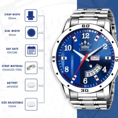 Unveil the Essence of Time with the LIMESTONE Day Date Blue Dial Metal Strap Watch for Men!