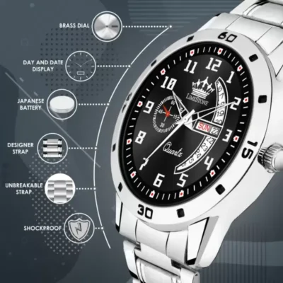 Whether it’s a casual outing, a party, a wedding, or formal engagements, the Day and Date Functioning Steel Strap New Quartz Series effortlessly complements your attire. The Silver strap and Black dial add a touch of sophistication, making it suitable for diverse occasions.