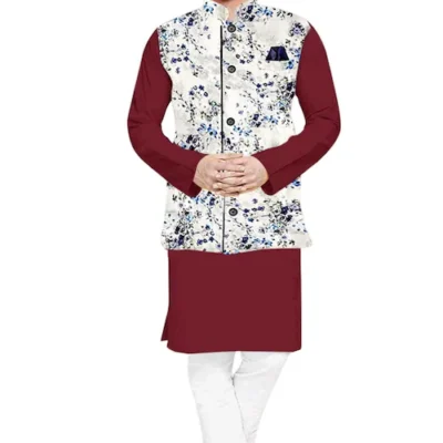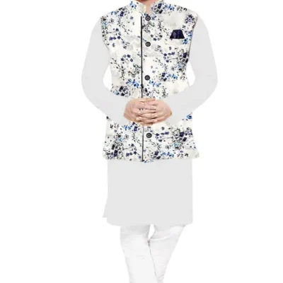 This Men’s Plain Kurta Payjama Pajama set, coupled with the Printed Flower Koti, offers a remarkable blend of style and cultural heritage. The Nehru Modi Jacket enhances the ensemble, presenting an eye-catching fusion of traditional and contemporary designs.