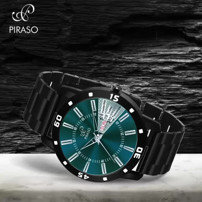 In the fast-paced world we navigate every day, time is of the essence, and your style should reflect the precision and sophistication that time demands. Introducing the PIRASO Analog Day & Date Working Display Turquoise Dial & Black Chain Watch for Men – a masterpiece that seamlessly blends functionality with fashion.