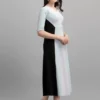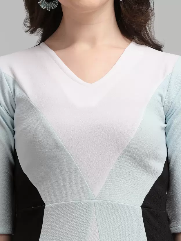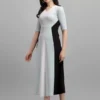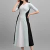 Elegance Meets Comfort: The dress features a stunning color-blocked pattern in shades of Sky Blue, Black, and White, exuding a contemporary vibe while maintaining an air of timeless grace. The empire waist design accentuates your silhouette, offering a flattering fit for all body types.