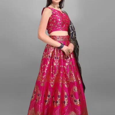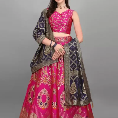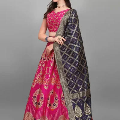 Dive into the exquisite charm of the Shopsy Solid Semi Stitched Lehenga Choli, your ultimate ensemble for any grand celebration. Embrace the allure of a perfectly pink palette, meticulously crafted to ensure you radiate splendor and grace at every event. The elegant semi-stitched lehenga features a luxuriant cotton blend skirt embellished with gleaming zari work, a jacquard choli that promises to contour and complement your silhouette, and a flowing art silk dupatta that adds a touch of majestic finesse.
