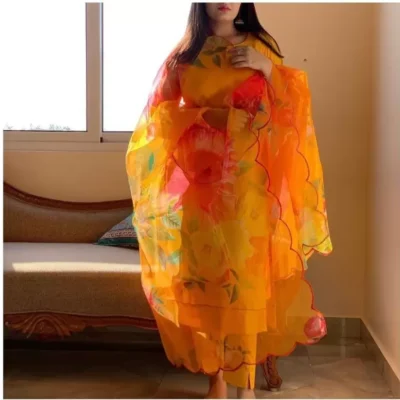 - Dupatta Detailing: Soft Dull Organza Cotton with captivating print border stitching, spanning 2.3 meters.