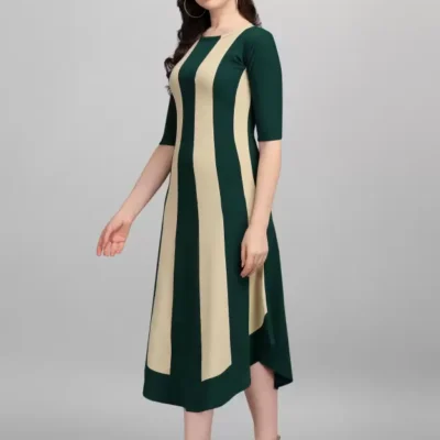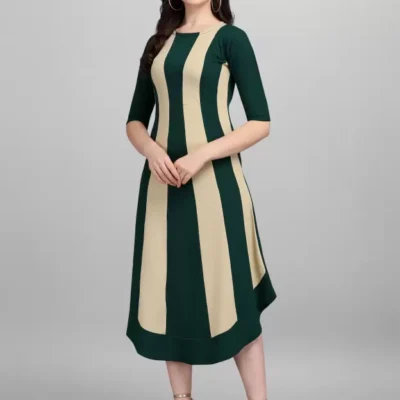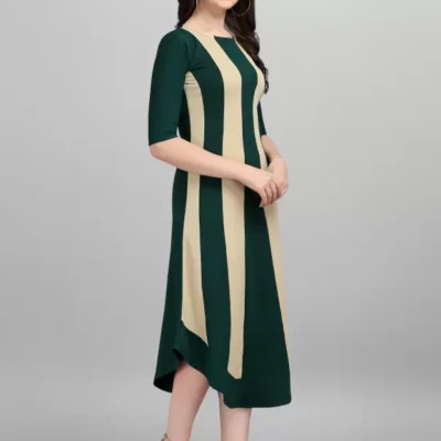 Channeling an elegant look, this dress from Shopsy grabs attention with its all-over design in captivating light olive and green hues. Crafted from a luxurious Lycra blend fabric, this high-low dress exudes sophistication and comfort in equal measure.
