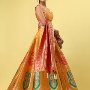 At the heart of this ensemble is the semi-stitched nature, offering the perfect balance of a tailored fit and the flexibility to customize. Whether you’re gracing a wedding or celebrating festivities, the combination of a sweetheart neck, sleeveless design, and the sheer elegance of zari work embellishments promises a look that’s as unique as you are.
