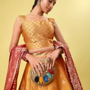 Crafted from luxurious art silk, the lehenga flows gracefully, catching the light and eyes alike. The jacquard choli, with its intricate patterns, tells a story of traditional weaving art, while the art silk dupatta completes the look, offering a canvas of subtle yet striking zari work that sparkles with every movement.
